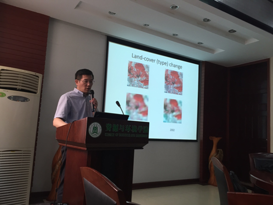 报告中,黄波教授提出时、空、谱、角四个方面的遥感影像融合新技术,解决了遥感影像信息繁多但无法同时获取时间分辨率、空间分辨率、光谱分辨率和角度分辨率均优的遥感影像数据的问题。最后,黄波教授就遥感影像融合的应用做了深入浅出的演说。包括每日气溶胶变化监测、土地利用分类、土地利用优化、土壤侵蚀非点源污染的监测和控制等。同时黄波教授特别指出,在农业遥感监测方面,时空谱角融合技术可以提供长时间序列的高光谱数据,为农作物长势的监测提供了便利。