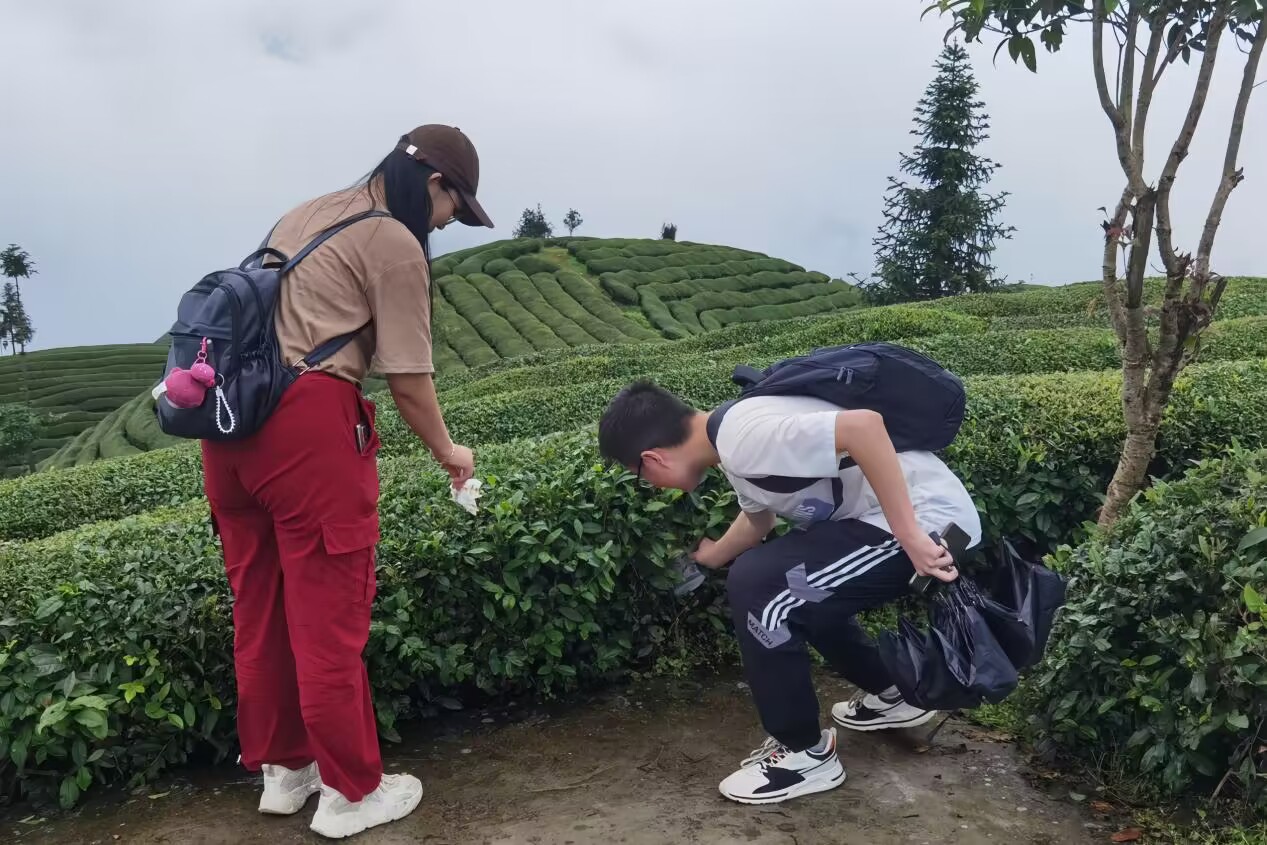 11日至13日,实践团来到了鹤峰县走马镇,向当地居民了解学习木耳山茶园的相关情况。在对木耳山当地居民的走访中,小组成员们了解到,木耳山曾是一片荆棘丛生的乱石山。经过几代人的努力,昔日的荒山被改造成了如今的生态有机的绿色茶园。现在的木耳山已经成为了“中国三十座最美茶园”之一。进入木耳山实地调查的实践小组,尽管已经欣赏过屏山峡谷的美丽景色,但在真正踏入木耳山后,仍然为眼前的风光而震撼——远处群山逶迤,环抱万亩茶园,云雾缭绕,轻拢绿浪万顷;近处,无数个浑圆的山丘上,绿盈盈的茶树一行行排列,顺着山势梯次而上。由于天气仍为阴雨,山间堆着浓雾,山风推着团团薄雾,滑过满是绿色的山丘,光影变幻之间,茶山如诗如画。