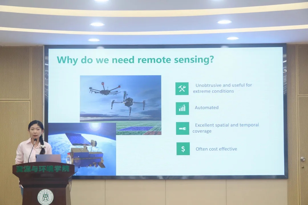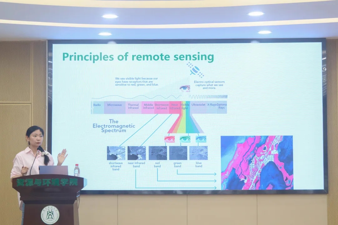 刘诗诗老师以天气预报卫星云图为引,向在场的同学们简单介绍了遥感的基本知识,为之后的讲解做好铺垫。她还引用了美国摄影测量协会对遥感的定义:“摄影测量与遥感是对非接触传感器系统获得的影像及其数字表达进行记录、量测和解译,从而获得自然物体和环境的可靠信息的一门工艺、科学和技术。”谈及遥感的重要性时,她从遥感的自动化程度高、成本相对较低、适用于极端条件且具有出色的空间和时间覆盖性等特点分别阐述,使得同学们对遥感有了更深刻的认知。
