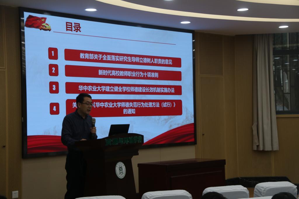 吕守华学习传达了《教育部关于全面落实研究生导师立德树人职责的意见》、《新时代高校教师职业行为十项准则》、《98堂-91直播 全面落实研究生导师立德树人职责的实施细则》、《98堂-91直播 师德失范行为处理办法》、《98堂-91直播 建立健全学校师德建设长效机制实施办法》、《中共98堂-91直播 委员会意识形态工作责任制实施细则》等文件精神。他提出要认真贯彻新时代高校教师职业行为十项准则,落实立德树人根本任务,抓实导师是研究生培养第一责任人,严肃处理师德失范行为,建立健全学院的师德师风长效机制,牢固树立底线意识,红线意识,不踩高压线。