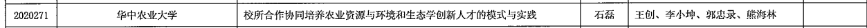 近日,湖北省教育厅发布了《省教育厅关于公布2020年湖北高校省级教学研究项目的通知》(鄂教高函[2021]10号)。在学校申报推荐的基础上,经专家评审、综合审核,省教育厅研究确定,98堂由蔡建波老师主持的《乡村振兴战略下新工科+新农科交叉融合的环境工程类一流人才培养的探索与实践》和石磊老师主持的《校所合作协同培养农业资源与环境和生态学创新人才的模式与实践》两项目被评为2020年度“湖北省高等学校省级教学研究项目”。