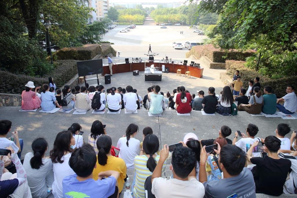 今天的主楼台阶,依然活跃着一群青年,他们席地而坐,或认真聆听、或举目张望,他们正在参加“狮山极目•无人机操作示范活动”,领略无人机操作风采。