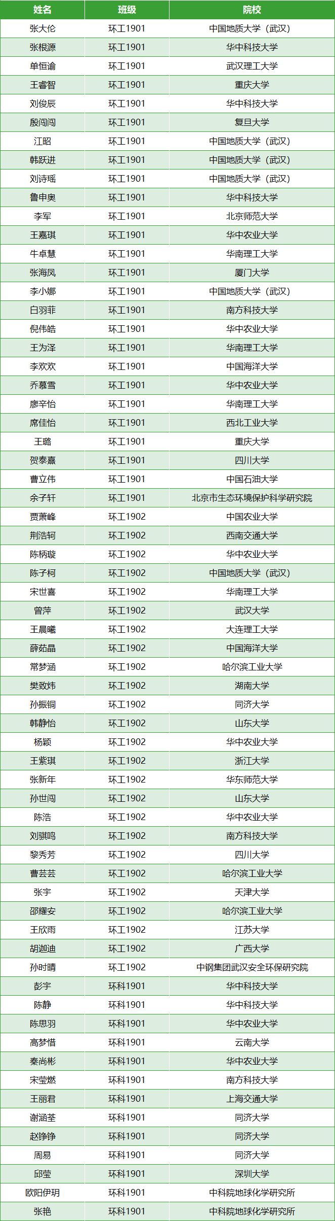 经统计,截止5月20日,2019级本科生共计322人,升学人数(境内)183人,占比56.83%,国(境)外升学11人。其中环境工程和环境科学的升学人数共计64人,详情如下: