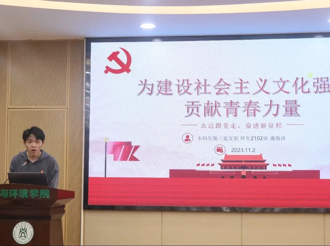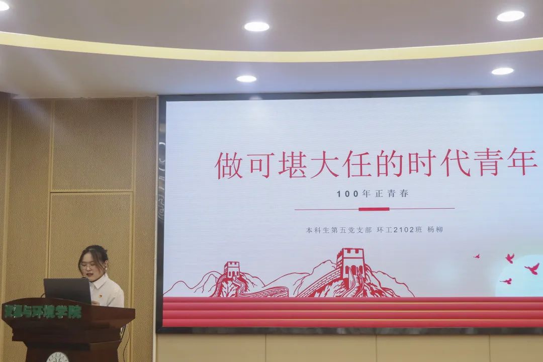 本科生第五党支部杨柳以 “做可堪大任的时代青年”为题,带领大家重温党史,从中共一大,到改革开放和社会主义建设新时期,再到中国特色社会主义新时代,一批批革命青年前赴后继,他们奋不顾身、勇担大任,毅然为党和国家献出自己的生命。演讲最后,她号召同学们:“时代赋予了青年无畏的底气,青年也定当披荆斩棘,笃定前行。不惧,展示青年勇气,不退,彰显青年担当。”