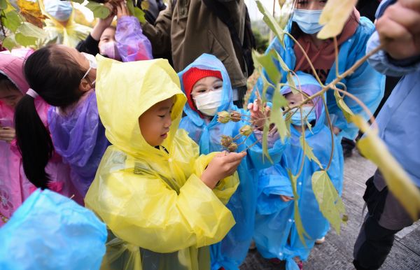 接着,何星毅带着同学们在生态岛上继续开展植物调查。初冬,不少植物的果实已经掉落在地,藏匿于落叶铺就的“黄金地毯”之下。何星毅介绍,这些黄黄的硬壳是无患子的果实,它是自然的清洁剂,剥开后蘸取少量黏液,再加点水搓洗便能起泡,起到清洁的作用。同学们争先恐后地尝试用无患子的果实洗手,用清水洗净后细细一闻,“有菠萝的香气!”小朋友笑着说。