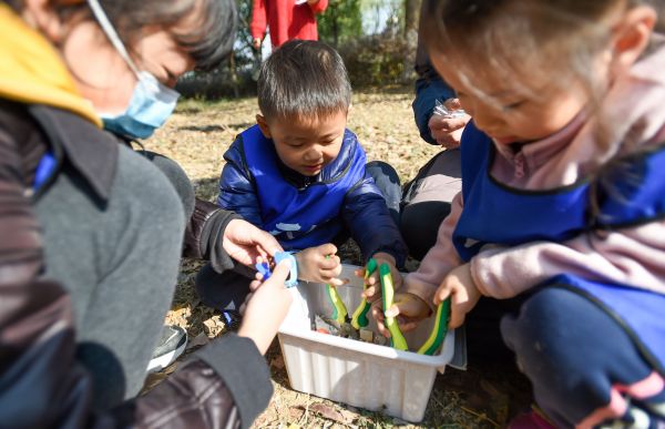 小朋友们用工具模拟鸟喙取食。许魏巍 摄