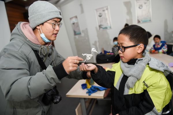 同学感受鹊鸲骨骼的重量。记者许魏巍 摄