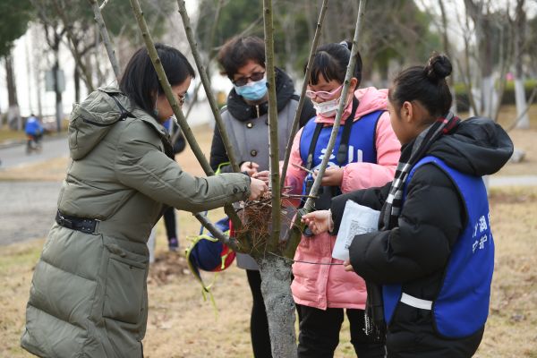 在沙湖公园临近湖边的乌桕树杈间,孩子们便发现了这样的一个鸟巢,黄俊铭介绍,喜鹊的鸟巢如同一个巨大的鸟蛋,乱中有序,内部中空,鸟儿会在鸟巢的其他位置给自己留上数个出入口。风雨天气,喜鹊还会用泥巴堵住漏雨的出入口,类似人们关上房门,然后从其他地方出入。“根据鸟类观察学家记录的数据显示,喜鹊搭建初期四五天内衔泥土600余次。”黄俊铭介绍道,同学们都好奇地举起观鸟望远镜,仔细观察鸟类的构造和造型。